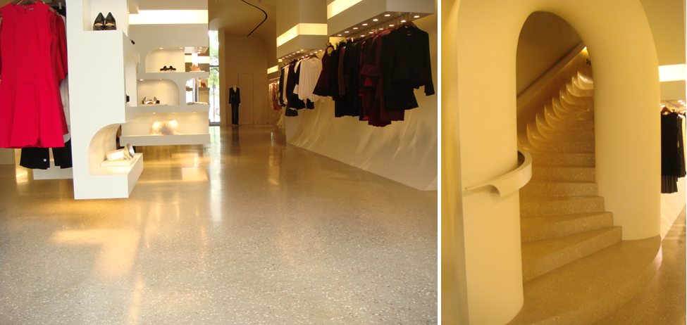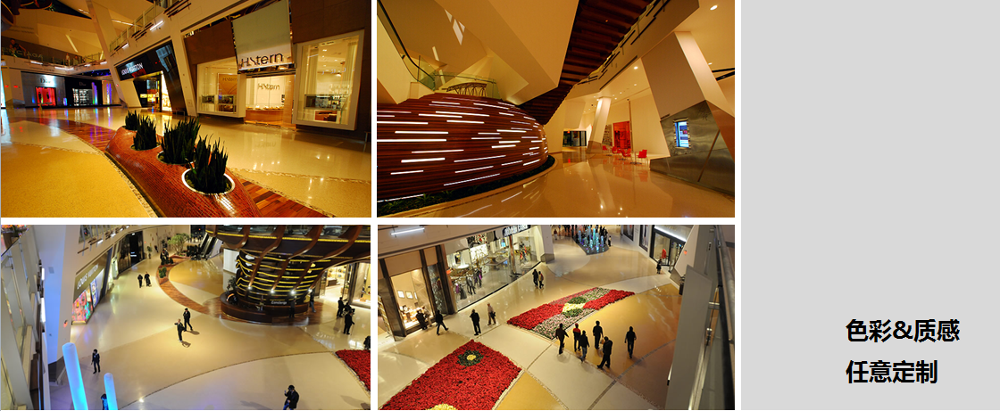 「整体地面」是一系列专门针对商业公共空间而设计的地面系统,由环保高分子聚合物材料及聚合物砂浆材料加各种不同特色的填料组成,针对不同的应用需求进行定制的无缝地面系统。采取现场整体成型施工工艺,具有大面积整体无缝,自由图案设计,个性色彩搭配以及耐久性等特性,适用于「机场候机楼、购物中心、文化场馆及酒店会所等公共空间 」。