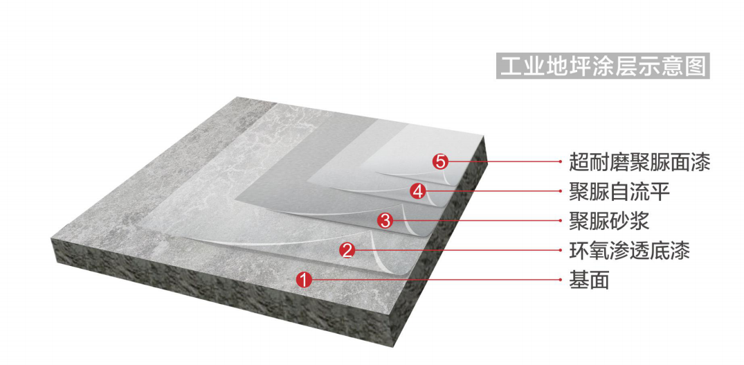 铁路动车检修车间传统地坪施工方案为环氧自流平涂装系统,该系统的优点是光鲜亮丽,装饰性强,但由于环氧属于刚性材料,易龟裂脱层,且不耐紫外线易黄变;硬度低(2H)易产生划痕。为了解决传统环氧地坪的以上不足,增加地坪的使用寿命,我公司结合多年地坪施工经验,设计采用聚脲工业地坪体系。
